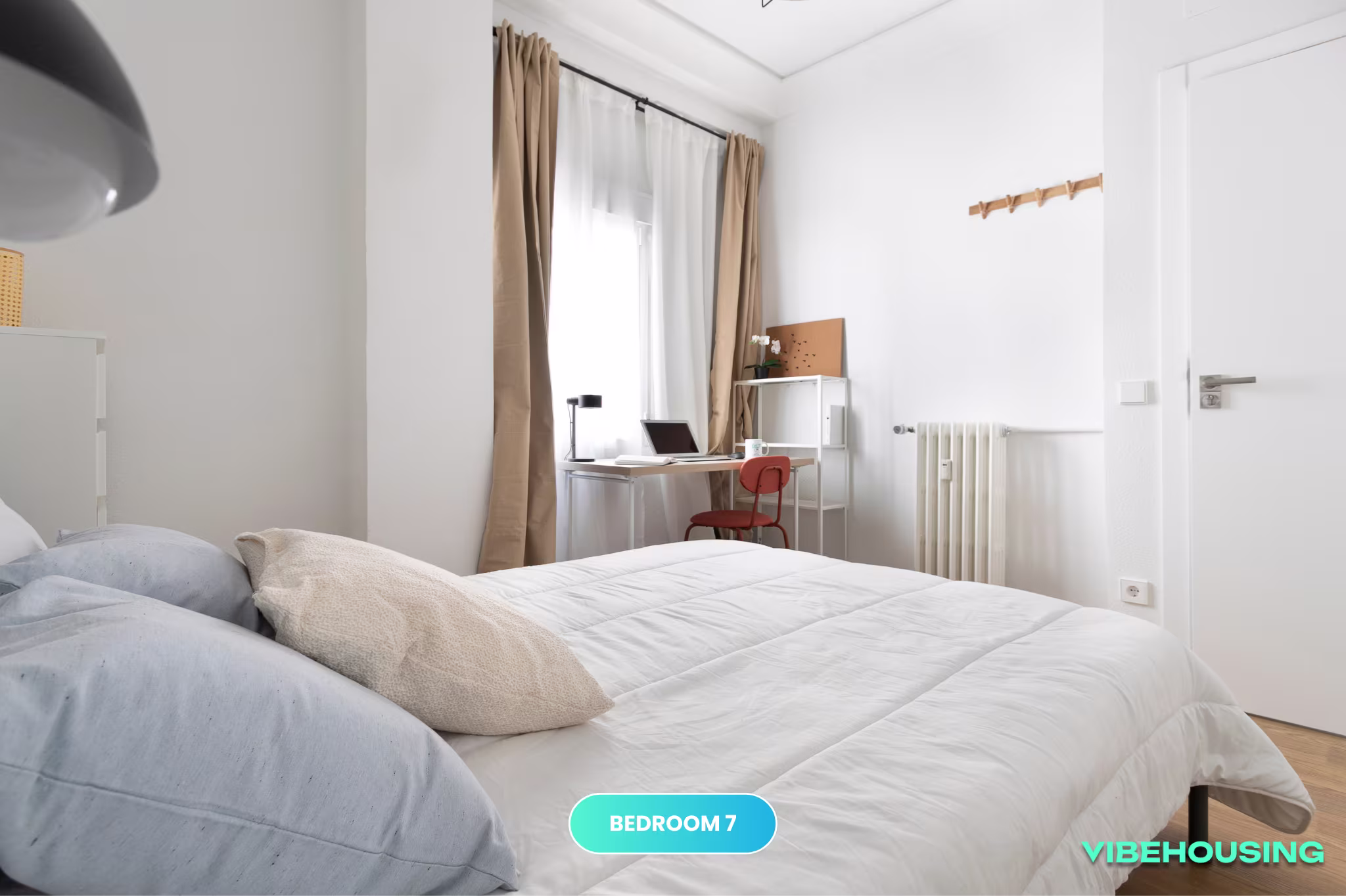 Esta habitación exterior de 12 m² es ideal para quienes buscan un espacio bien distribuido y con buena iluminación natural. Equipada con cama de 135 cm, escritorio, silla y armario, es perfecta para estudiantes y jóvenes profesionales que buscan tranquilidad y confort en un coliving moderno.