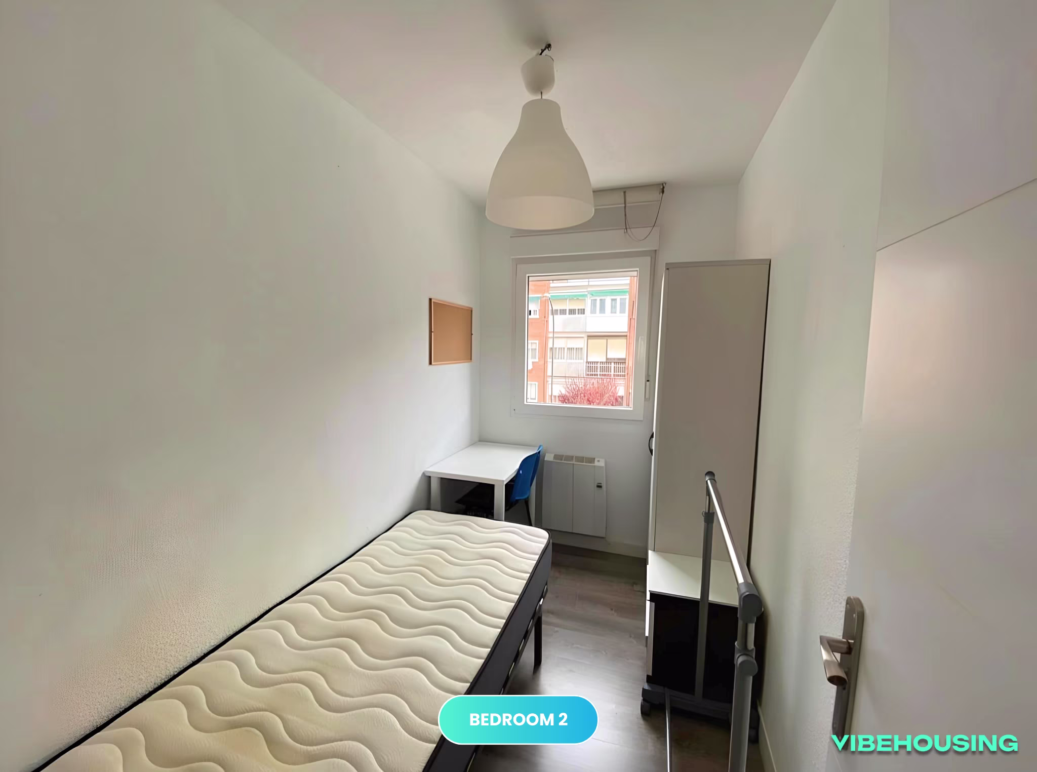Descubre esta habitación de 6 m² en un apartamento de coliving en Murcia 10, Getafe. Con una cama de 90 cm con somier y una vista exterior que aporta luz natural, es ideal para jóvenes profesionales y estudiantes de la UC3M que buscan un espacio compacto y funcional. El apartamento dispone de WiFi de alta velocidad y servicio de limpieza quincenal para mantener el espacio siempre limpio. Ubicada cerca de la UC3M y de transporte público, ¡es una gran opción para quienes buscan un lugar cómodo en Getafe!